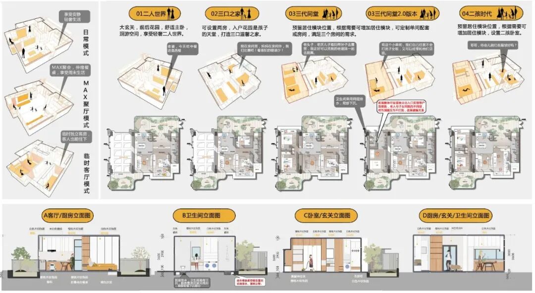 套型與室內(nèi)設(shè)計以“百變空間”為核心,通過可變家具和無柱空間設(shè)計,賦予用戶更多生活選擇權(quán),實現(xiàn)不同生活模式的靈活切換。滿足從單身、三口之家到三代同堂等不同家庭結(jié)構(gòu)在不同階段的空間使用需求。通過預(yù)設(shè)的彈性空間和可拓展的居住艙體,可為三代同堂家庭預(yù)留獨立出入口實現(xiàn)“一戶雙鑰匙”模式。